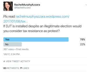 I want to be clear that I don’t suggest Tax Resistance as a method of protest within regular partisan politics. We are in an extreme and unique situation — an illegitimate election with an outcome that presents a clear and present danger. We have a crisis that must be addressed. An acceptable forms of resolution would be overturning Donald Trump’s win and holding a new vote with the full protections of the Voting Right’s Act in place. We would also demand a bipartisan investigation with a special prosecutor on the relationship between the Trump Campaign and Russia, including an ethics review of the RNC, GOP and FBI Director Comey’s actions regarding this election.